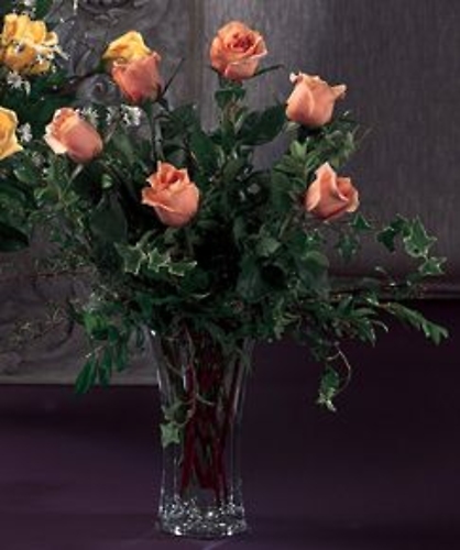 6 Peachy/Orange LONG STEM Beautiful Roses arrive nicely arranged in a clear glass vase with dark green greenery. This 1