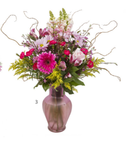 A Fragrant Vase arrangement features a flower called Stock. It is the lavender/purple flower you see in the center of