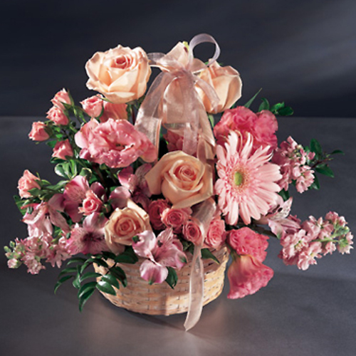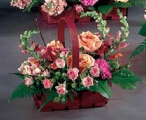 Orange Roses, Orange Snapdragons, Pink Spray Roses, Pink Carnations, Peach Stock Are Artfully Arrangened in a Basket wit