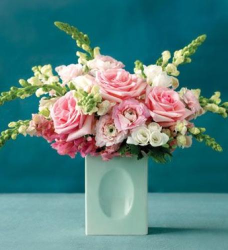 A pretty pink vase that reflects back on the pink colors in this pink fresh flower arrangement ! &nb