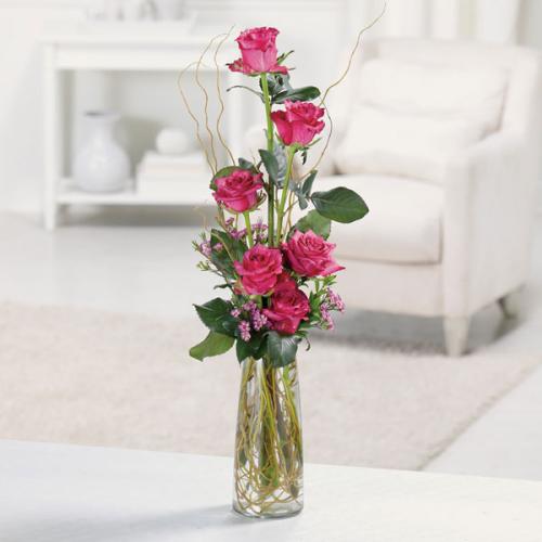 6 Coral, Red, Pink, White or Lavender Roses with Salal and Leatherleaf in a modern day glass vase. Leav