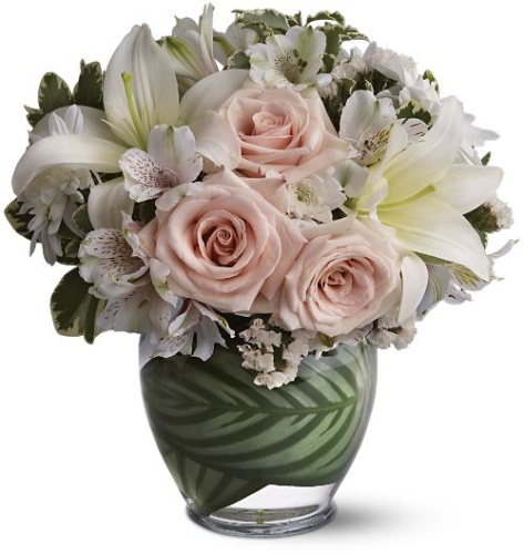 So soft and so pretty this arrangement is that we call it ENCHANTMENT! Soft creamy pink/peach roses, white lilies