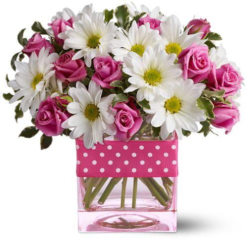 This delightfully cheery bouquet of white daisies and pink spray roses is presented in a modern day glass cube vase and