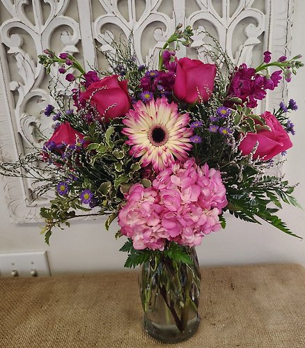 A pretty pink vase that reflects back on the pink colors in this pink fresh flower arrangement ! &nb