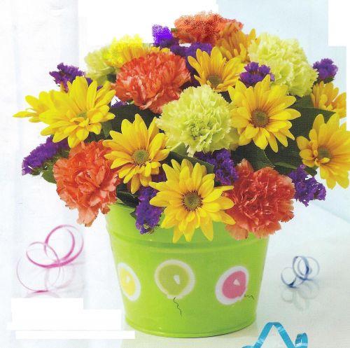 BUCKET OF CELEBRATION WISHERS Turn their celebration into a garden party with this festive gathering of carnations, dai