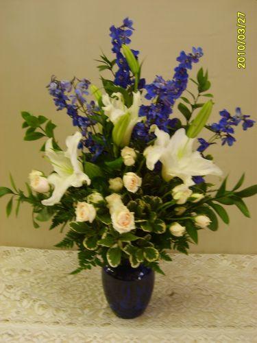 Beautiful Blue Delphenium is arranged in a blue glass vase along with white lilies and roses. Stunning arrangement and